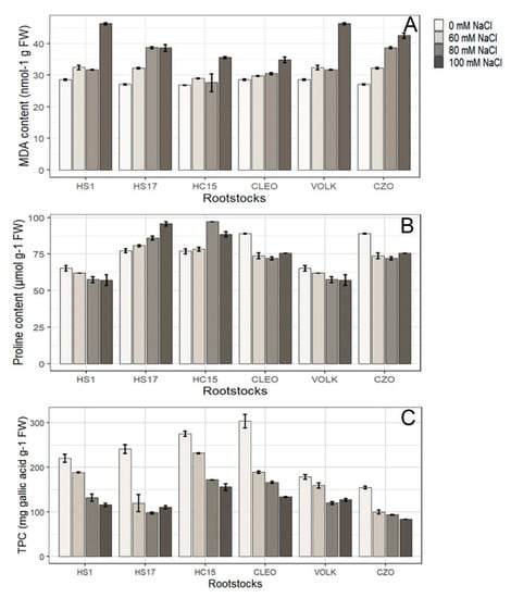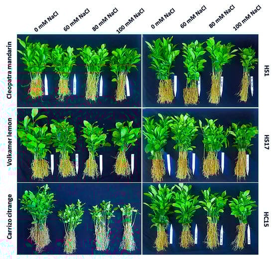 - Alam, A.; Ullah, H.; Attia, A.; Datta, A. Effects of salinity stress on growth, mineral nutrient accumulation and biochemical parameters of seedlings of three citrus rootstocks. Int. J. Fruit Sci. 2020, 20, 786–804. [Google Scholar] [CrossRef]