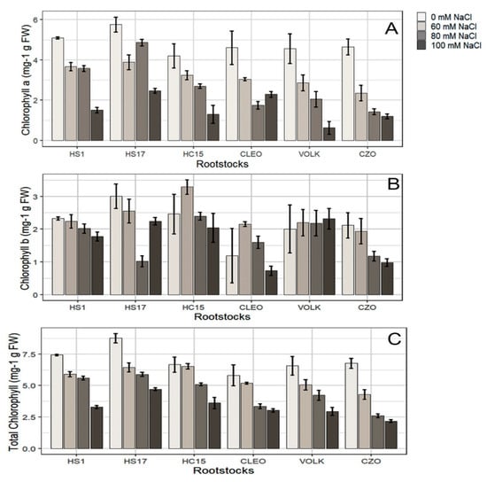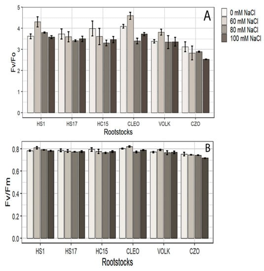 - López-Climent, M.F.; Arbona, V.; Pérez-Clemente, R.M.; Gómez-Cadenas, A. Relationship between salt tolerance and photosynthetic machinery performance in citrus. Environ. Exp. Bot. 2008, 62, 176–184. [Google Scholar] [CrossRef]