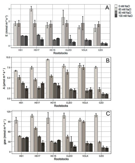 3.2. Effect of Salinity Stress in Physiological Changes in Citrus Rootstocks