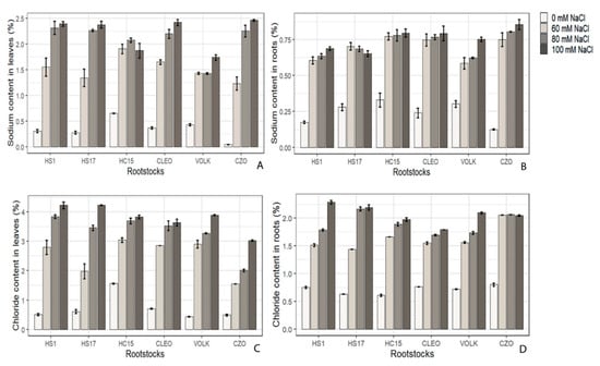 - Moya, J.L.; Gómez-Cadenas, A.; Primo-Millo, E.; Talon, M. Chloride absorption in salt-sensitive Carrizo citrange and salt-tolerant Cleopatra mandarin citrus rootstocks is linked to water use. J. Exp. Bot. 2003, 54, 825–833. [Google Scholar] [CrossRef]