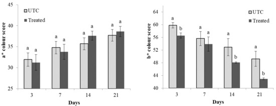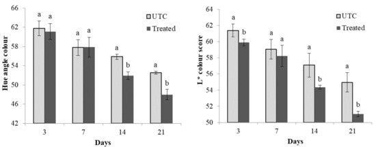 Skin colour parameters (a*, b*, hue angle and L*) of treated and untreated control (UTC) ‘Jiro’ persimmon fruit during storage at 15 °C for up to three weeks. Data are means (n = 3) and standard deviations around the mean are shown in error bars. Values with the same letter within each assessment time are not significantly different using the LSD test at p < 0.05.
