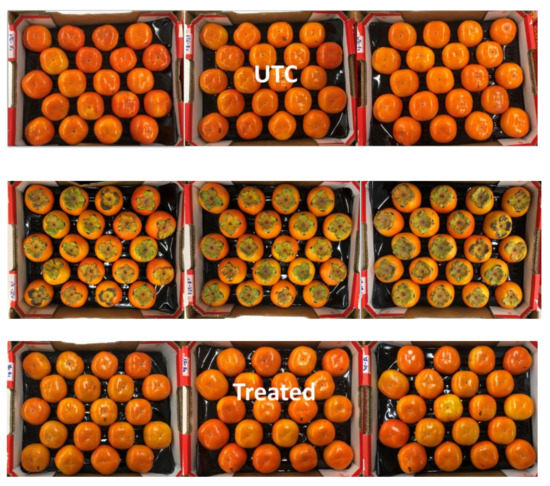 Untreated control (UTC) (top) and treated (lower) ‘Jiro’ persimmon fruit three days after treatment.