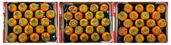 There were few differences in the fruit skin colour of ‘Jiro’ persimmons (as measured with the Minolta colour meter) within the first week of storage at 15 °C (Figure 1). However, after 7 days of storage at 15 °C, treated fruit tended to be darker orange/red, as noted with lower “b” value, hue angle and L* values in treated fruit (Figure 1). This is also illustrated in Figure 2 and Figure 3, which show the photos of the fruit three days after treatment (Figure 2) and after three weeks storage at 15 °C (Figure 3), where these observed differences between the treatments were not outside commercial acceptability. Previous research on the effects of low dose irradiation on persimmon fruit quality have shown no effect of irradiation treatment on ‘Fuyu’ fruit colour [9,10].