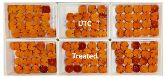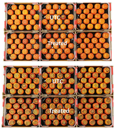 Untreated control (UTC) (top) and treated (lower) ‘Jiro’ persimmon fruit after three weeks storage at 15 °C.