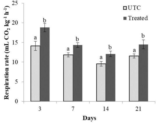 Fruit respiration rate (mL CO2 kg−1 h−1) of treated and untreated (UTC) ‘Jiro’ persimmon fruit during storage at 15 °C for up to three weeks. Data are means (n = 3) and standard deviations around the mean are shown in error bars. Values with the same letter within each assessment time are not significantly different using the LSD test at p < 0.05.