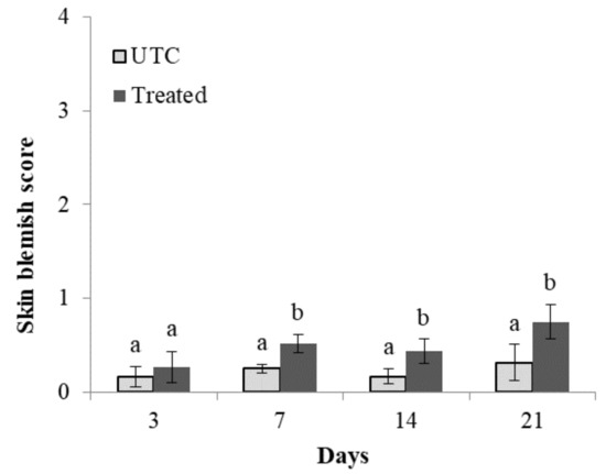 Skin blemish of treated and not treated (UTC) ‘Jiro’ persimmon fruit during storage at 15 °C for up to three weeks. The skin was visually rated as % of the fruit surface affected by blemish based on the following scale: 0 = no blemish (0% blemish); 1 = trace (<10% blemish); 2 = slight (11—25% blemish); 3 = moderate (26–50% blemish), and 4 = severe (>51% blemish). Data are means (n = 3) and standard deviations around the mean are shown in error bars. Values with the same letter within each assessment time are not significantly different using the LSD test at p < 0.05.