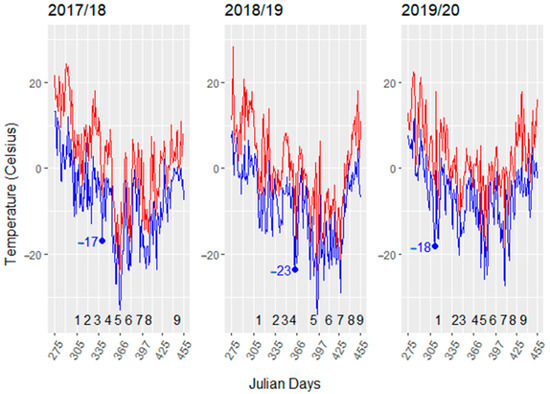 Dormant season temperatures for 2017 to 2020. The daily maximum and minimum temperatures are indicated by red and blue lines, respectively. Numbers from 1 to 9 indicate tissue sampling time in each dormant season. The blue dot indicates the first date that the minimum temperature was below −15 °C in each dormant season. The first day of each month for a dormant season (November through April) are 305, 335, 366, 398, 426, and 457 Julian days, respectively.