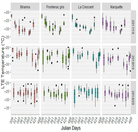 Grapevine bud freezing tolerance increases from October to February with decreasing and subzero freezing temperatures [30]. Typically, the maximum freezing tolerance occurs in January and then begins to decrease with increasing temperatures in February or March [31,32,33]. Interspecific cultivars are reported to have a wide range of inherent cold hardiness and winter survival characteristics [2,33]. The results of this study showed the complex interactions of the grapevine cultivar freezing tolerance and bud dormancy phenotype in response to changing temperatures. Sampling time and season influenced bud freezing tolerance in interspecific cultivars and data modeling predicted factors influencing bud freezing tolerance across years with varying field conditions. Differing field temperatures impacted LTEs (temperatures of bud injury due to intracellular freezing) at the various sampling times; however, differences between cultivars were consistent from year to year. As shown for other grape cultivars, in mild winters, LTEs are less negative than in colder winters [8,13]. This can be seen in the LTEs for Brianna averaging −24.7 °C and −26 °C in 2018/19 and 2019/20, respectively. January is generally considered the period of the dormant season when vines will be at their maximum freezing tolerance. The muscadine cultivars Carlos and Summit were maximally hardy in January [34]. In V. vinifera cultivars and hybrids Vignole and St. Vincent the bud cold hardiness correlates with the recent cold temperatures [35]. In this study, the lowest cultivar LTEs occurred in January in 2018 and 2020; however, in 2019 the lowest LTEs occurred in March in conjunction with field temperatures approaching −30 °C.