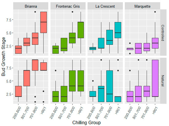 Chilling fulfillment descriptive analysis was performed using psych library in R [27]. The effect of cultivar (4), chilling accumulation method (natural or controlled), chilling hour accumulation group (200–500, 501–700, 701–900, and >901 chilling hours), season (3) and their interactions on bud break growth stages were assessed by ANOVA using stats package in R [28]. A model that included all main effects and interaction effects was tested for normality assumptions.