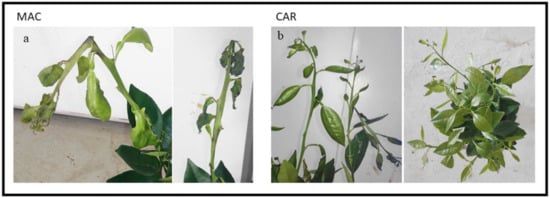 Damaged shoots of Citrus macrophylla (a) and Carrizo citrange (b) seedlings grafted with the Valencia delta seedless variety exposed to 0 °C for 30 days.
