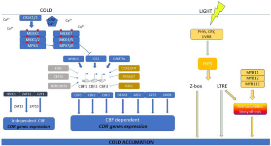 Plants process and integrate the signals surrounding them related to seasonal changes and light. This is a crucial element for their response to acclimatization and tolerance to cold (Figure 2). Phytochromes (PHYA, PHYB, PHYC, PHYD and PHYE) absorb red and far-red light, while cryptochromes (CRY1, CRY2, and CRY3) absorb blue light and UV-A light [73]. Phytochromes are known to activate COR genes like COR15a and COR14b, and regulate the genes targeted by CBFs under near/far-red light conditions [74].
