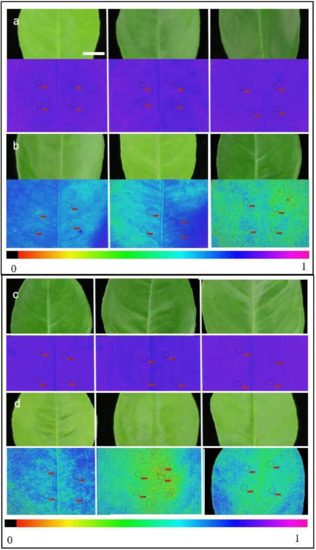 Representation of CFI (chlorophyll fluorescence imaging technique) of cold symptoms in citrus leaves exposed for 30 days to 1 °C. (a,c) are the control groups of Carrizo citrange rootstock and Citrus macrophylla rootstock, respectively, grafted with the Valencia delta seedless variety. (b,d) where the cold treatment group of the Carrizo citrange rootstock and the Citrus macrophylla rootstock, respectively, grafted with the Valencia delta seedless variety.