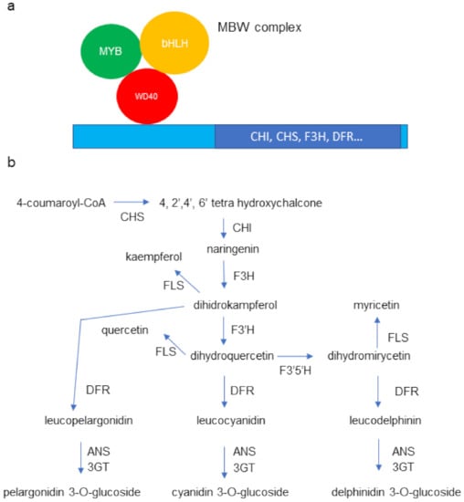 Schematic representation of the anthocyanin pathway. (a) Sketch of the MBW anthocyanin pathway activation complex and (b) genes that encode their biosynthesis enzymes; CHS (chalcone synthetase), CHI (chalcone isomerase), FLS (flavonol synthetase), F3H (flavonone 3′-hydroxylase), F3′H (flavonoid 3′-hydroxylase), F3′5′H (flavonoid 3′5′ hydroxylase), DFR (dihydroflavonol 4-reductase), ANS (anthocyanidin synthetase), and UFGT or 3GT (UDP-glucose-flavonoid glucosyl transferase).