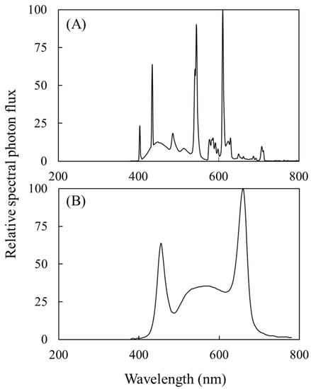 The relative spectral photon flux of (A) cool white fluorescent lamps and (B) LED lights. The wavelengths of light sources were recorded at 380–800 nm with a spectrometer.