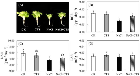 Effects of exogenous chitosan (CTS) on (A) plant morphology and (B–D) plant growth analysis parameters of lettuce plants under salt stress. Data presented are the means ± SEs (n = 3). Different letters on top of bars indicate a significant difference (p < 0.05) according to Tukey’s HSD test. CK (control) = 0 mM NaCl + 0 mg/L CTS; CTS = 0 mM NaCl + 100 mg/L CTS; NaCl = 100 mM NaCl + 0 mg/L CTS; NaCl + CTS = 100 mM NaCl +100 mg/L. RGR, relative growth rate; NAR, net assimilation rate; LAR, leaf area ratio.