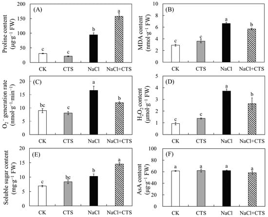 Effects of exogenous chitosan (CTS) on (A) proline content, (B) MDA content, (C) O2− generation rate, (D) H2O2 content, (E) soluble sugar content, and (F) AsA content in leaves of lettuce plants under salt stress. Data presented are the means ± SEs (n = 3). Different letters on top of bars indicate a significant difference (p < 0.05) according to Tukey’s HSD test. CK (control) = 0 mM NaCl + 0 mg/L CTS; CTS = 0 mM NaCl + 100 mg/L CTS; NaCl = 100 mM NaCl + 0 mg/L CTS; NaCl + CTS = 100 mM NaCl +100 mg/L. MDA, malondialdehyde; O2−, superoxide radical; H2O2, hydrogen peroxide; AsA, ascorbic acid.