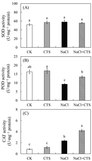 Effects of exogenous chitosan (CTS) on activities of (A) SOD, (B) POD, and (C) CAT in leaves of lettuce plants under salt stress. Data presented are the means ± SEs (n = 3). Different letters on top of bars indicate a significant difference (p < 0.05) according to Tukey’s HSD test. CK (control) = 0 mM NaCl + 0 mg/L CTS; CTS = 0 mM NaCl + 100 mg/L CTS; NaCl = 100 mM NaCl + 0 mg/L CTS; NaCl + CTS = 100 mM NaCl +100 mg/L. SOD, superoxide dismutase; POD, peroxidase; CAT, catalase.