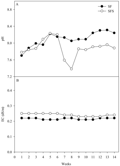 Weekly pH (Panel (A)) and EC (Panel (B)) in starfish (SF)- and starfish + seaweed (SFS)-liquid fertilizers at weeks of storage.