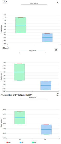 SF-OF plots showed decreasing numbers of OTUs and a lower richness estimate and diversity index with respect to the bacterial community compared to those of SF-GH plots (Table 4). The bacterial community was not significantly different between the SFS-OP and SFS-GH plots. GH plots were found to show high ACE (Figure 2A), Chao1 (Figure 2B), and the number of OUTs (Figure 2C) in the bacterial community compared to OF plots, indicating greater bacterial richness and diversity. EC levels mostly affected bacterial community structure, important in nutrient cycling and mineralization, which can be a primary estimator of the bacterial activity in the soil [9,22,23]. The phyla Planctomycetes and Firmicutes are favorable to high EC in soils with warm and humid conditions [9] and were present in considerable numbers in the GH plots applied with SF and SFS (Figure 3). The phylum Firmicutes mainly contains two classes of Clostridia and Bacillus capable of degrading large organic molecules to small molecules, converting N2 into ammonia, and stimulating nitrification and denitrification as part of the N-cycle [20]. Acidobacteria are known for a weak tolerance of salt accumulation in the soil [9,20], which was not consistently observed in the OF and GH plots below saline soils of 4.0 dS m−1 [23,24].