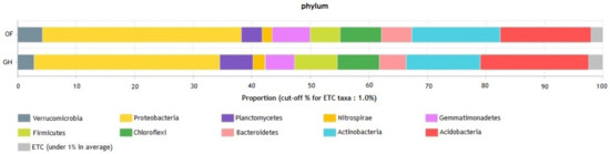 Relative abundance of the dominant bacterial phyla in soil on June as affected by open-field (OF) and greenhouse (GH) cultivated red peppers.