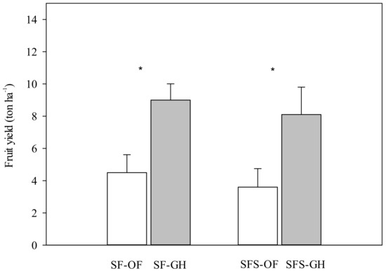 Fruit yield as affected by starfish (SF)- and starfish + seaweed (SFS)-liquid fertilizers applied in open-field (OF) and greenhouse (GH) cultivated red peppers. Bars represent the error of the mean. * significantly different mean values (n = 3 plants) between treatments for each system at p ≤ 0.05.