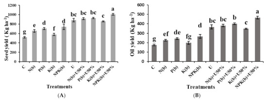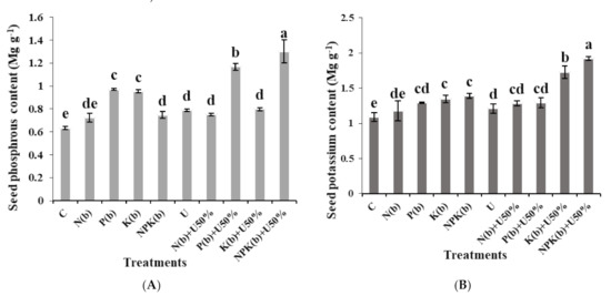 The plants treated with NPK(b) + U50% showed the highest seed P content of 1.30 (mg g−1), and the control plants exhibited the lowest one 0.63 (mg g−1). The treatment of NPK(b) + U50% differed from other treatments significantly. According to the means comparison, the treatment of NPK(b) + U50% increased the seed P content by 105.26%, and the treatment of P(b) + U50% increased it by 84.21% (Figure 8A).