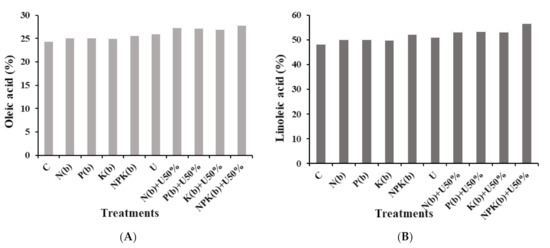 According to the results about the profile of fatty acids of N. sativa, the highest oleic acid percentage (27.85%) was obtained from NPK(b) + U50% and the lowest (24.43%) was from the control. It was found that NPK(b) + U50% and P(b) + U50% increased the oleic acid content by 33.99 and 11.91%, respectively (Figure 3A).