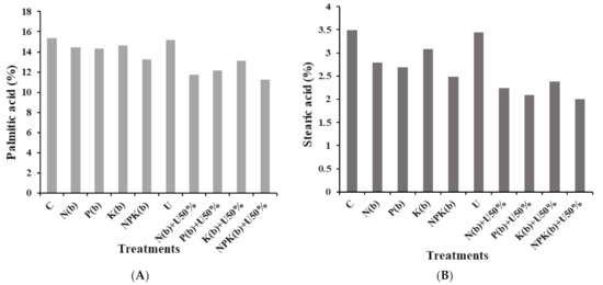 It was found that the highest stearic acid content of 3.5% was related to the control and the lowest one (2.01%) was related to the plants treated with NPK(b) + U50% The plants treated with NPK(b) + U50% and P(b) + U50% showed 42.57 and 40% lower stearic acid content than the control, respectively (Figure 5B).