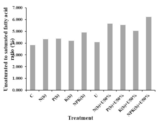 The ratio of unsaturated fatty acids to saturated fatty acids is shown in the graph (Figure 6), which displays an increase in the ratio of unsaturated fatty acids to saturated fatty acids in NPK (b) + U50%.