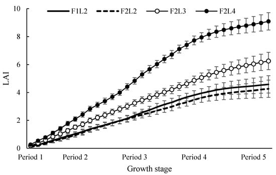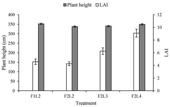 As a result of the relative comparison of plant height according to the LAI of each treatment plot to examine the complex relationship between growth indicators (Figure 3), when the number of leaves was the same, the LAI was slightly higher in the treatment plot with a small fruit setting number, although such a difference was not statistically significant. However, when the number of leaves was set as the same and the number of leaves was adjusted, the higher the number of leaves, the higher the LAI. The resulting overall plant height showed similar values, although F1L2 and F2L4 showed the highest values. This was considered to be due to the fact that, in the treatment plot with a small fruit setting number, assimilates consumed by the fruit were less. Thus, the more the number of leaves, the more it was biased toward a vegetative growth []. These results are thought to be due to that fact that a low crop load will decrease fruit sink strength, leading to extra accumulation of non-structural carbohydrates in source leaves [].