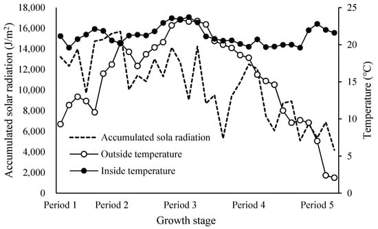 Weekly integrated accumulated solar radiation, 24-h average air temperature outside the greenhouse, and 24-h average air temperature inside the greenhouse.