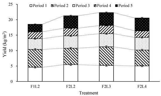 However, in Period 2, F1L2 showed a higher yield than F2L2, although the growth length in Period 2 was longer in F2L2 than that in F1L2. The growth balance was relatively broken in F2L2 compared to that in F1L2 due to underdeveloped stem diameter, which was considered to be the effect of difference in the average fruit weight that was significantly different, not due to the difference in the fruit setting number that was not significantly different. When each fruit setting number was the same, the initial yield was benefitted by removing the number of leaves during early stages of growth. The reduction in yield may have been due to the growth imbalance caused by the removal of the lateral branches at the late stage of growth []. As for the initial yield, it was found that F2L2 and F2L3 showed better yields than F2L4. F2L4 showed a higher yield than F2L2 and F2L3 in late stages of growth. In the case of the total yield, similar to the result that proper leaf removal could increase the yield [], the yield was the highest in the F2L3 treatment group where the number of leaves had an intermediate value. In the case of total production, the highest production was seen in the F2L3 treatment plot, similar to a previous study showing that proper removal of the number of leaves could increase production [].