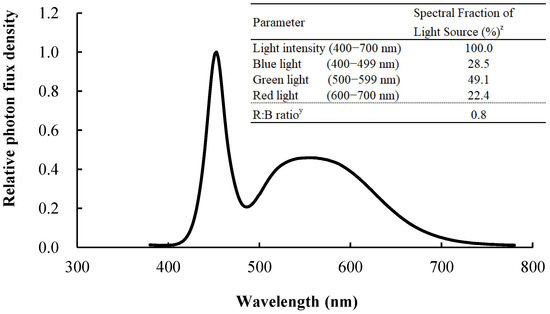 The average daily light intensity of natural light in the Venlo-type greenhouse was 160 μmol m−2 s−1 during the experimental period (3–24 December 2020), with an average daily light integral of 5.5 mol m−2 d−1. Combined with the suitable daily light integral for the growth of cucumber seedlings based on our previous study [36], they were grown under supplemental DLI at 6.0 mol m−2 d−1 created by four levels of light intensity at 278, 208, 167, and 139 μmol m−2 s−1 combined with supplementary light duration at 6, 8, 10, and 12 h d−1 provided by white LEDs (Weifang Hengxin Electric Appliance Co., Ltd., China) for 21 days. The supplementary lighting time in the morning and in the afternoon was the same. In addition, cucumber seedlings grown without supplementary light were set as the control (DLI at 5.5 mol m−2 d−1 from solar radiation only). A randomized complete block designed with three replications and 72 seedlings in each replication was cultivated in this experiment. Each treatment had three plug trays, and each tray was considered as a replication. Spectral distribution of the LED lamps (Figure 1) used in this study as supplementary light was measured by a spectrometer (PG100N, United Power Research Technology Corporation, China) at the plant canopy.