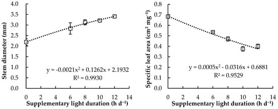 The stem diameter of the cucumber seedlings was positively correlated with supplementary light duration and the SLA of cucumber seedlings exhibited an opposite trend (Figure 1), allowing us to infer that longer light duration with lower light intensity resulted in thick stems and thin leaves with a larger leaf area (Table 2). The SLA of the cucumber seedlings significantly decreased with the administration of supplementary light, which was consistent with previous studies. Previous studies demonstrated that lower DLI led to higher SLA in tomato plants [54], sweet basil [51], and lettuce [11]. However, a decreased trend was observed in the SLA of cucumber seedlings grown with a decreased light intensity (increased light duration) with the same DLI (Figure 2), suggesting that the decreased SLA of cucumber seedlings was due to the impacts of light duration instead of light intensity in plants grown with the same DLI. A previous study indicated that the SLA of basil and chicory presented linear negative responses to an increased photoperiod [55]. Similarly, Elkins and van Iersel [43] observed that the SLA of Rudbeckia seedlings decreased linearly from 266 to 197 cm2 g−1 as the photoperiod increased from 12 to 21 h d−1 with same DLI at 12 mol m−2 d−1. However, no significant differences were observed in the SLA of greenhouse-grown lettuce supplemented with different combinations of light intensity and photoperiod with the same DLI at 17.0 mol m−2 d−1 [42]. These differences may be due to the different species, supplementary DLI, or lighting strategies.
