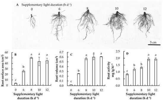 Effects of supplementary light duration with same daily light integral on root morphology and root activity of cucumber seedlings grown in the greenhouse for 21 days after sowing. (A) One representative picture was shown for each treatment, (B) root surface area, (C) root volume, and (D) root activity. Means followed by different letters within each parameter are significantly different based on the least significant difference (LSD) test (p < 0.05). Error bars show mean ± standard deviation.