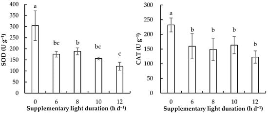 Effects of supplementary light duration with the same daily light integral on the activities of superoxide dismutase (SOD) and catalase (CAT) of cucumber seedlings grown in the greenhouse for 21 days after sowing. Means followed by different letters within each parameter are significantly different based on the least significant difference (LSD) test (p < 0.05). Error bars show mean ± standard deviation.