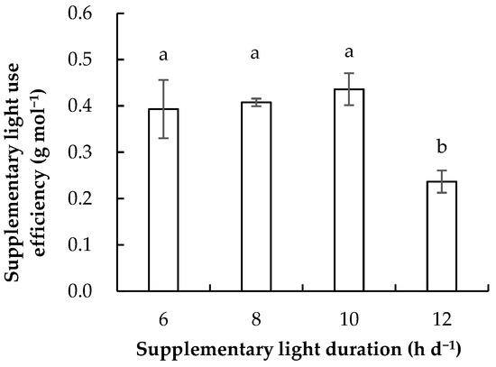 Supplementary light use efficiency of cucumber seedlings grown with light duration at 6, 8, 10, and 12 h d−1 with the same daily light integral in the greenhouse for 21 days after sowing. Means followed by different letters within each parameter are significantly different based on the least significant difference (LSD) test (p < 0.05). Error bars show mean ± standard deviation.