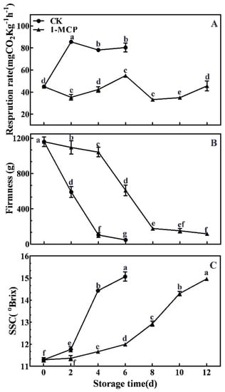 Effects of 1-MCP treatment on respiratory rate (A), firmness (B) and soluble solid content (C) in ‘Jinyan’ kiwifruit during storage. Error bars indicate standard error (±SE). Different letters in the same figure represent a significant difference at p < 0.05 according to Duncan’s new multiple range test. d: days.