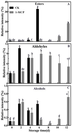 Effects of 1-MCP on the relative contents of ester (A), aldehyde (B) and alcohol (C) in ‘Jinyan’ kiwifruit during storage. Error bars indicate standard error (±SE). Different letters in the same figure represent a significant difference at p < 0.05 according to Duncan’s new multiple range test. d: days.