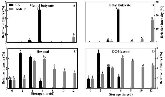 Effects of 1-MCP treatment on the relative contents of ethyl butyrate (A), methyl butyrate (B), hexanal (C) and E-2-hexenal (D) in ‘Jinyan’ kiwifruit during storage. Error bars indicate standard error (±SE). Different letters in the same figure represent a significant difference at p < 0.05 according to Duncan’s new multiple range test. d: days.