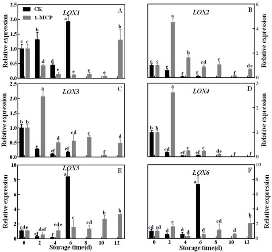 Effects of 1-MCP treatment on the gene expression level of lipoxygenase (LOX)’s ((A) AcLOX1, (B) AcLOX2, (C) AcLOX3, (D) AcLOX4, (E) AcLOX5, (F) AcLOX6) in ‘Jinyan’ kiwifruit during storage. Error bars indicate standard error (±SE). Different letters in the same figure represent a significant difference at p < 0.05 according to Duncan’s new multiple range test. d: days.