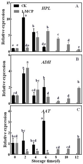 Effects of 1-MCP treatment on the gene expression level of hydroperoxidelyase (HPL) (A), alcohol dehydrogenase (ADH) (B) and alcohol acyltransferase (AAT) (C) in ‘Jinyan’ kiwifruit during storage. Error bars indicate standard error (±SE). Different letters in the same figure represent a significant difference at p < 0.05 according to Duncan’s new multiple range test. d: days.