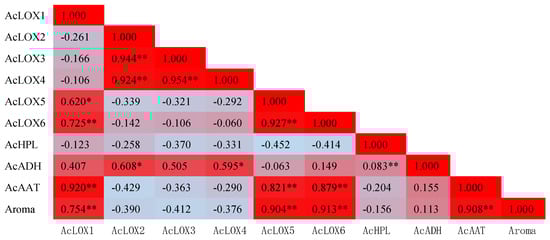Correlation coefficients between total aroma content and expression level of biosynthesis-related genes in ‘Jinyan’ kiwifruit (* correlation is significant at the 0.05 level; ** correlation is significant at the 0.01 level).