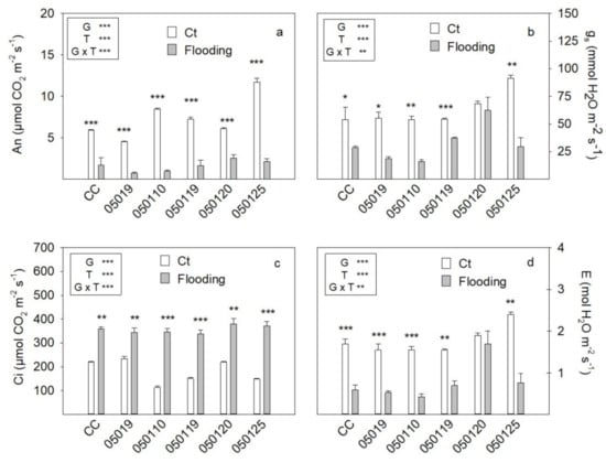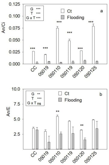 - Arbona, V.; López-Climent, M.F.; Pérez-Clemente, R.M.; Gómez-Cadenas, A. Maintenance of a high photosynthetic performance is linked to flooding tolerance in citrus. Environ. Exp. Bot. 2009, 66, 135–142. [Google Scholar] [CrossRef]