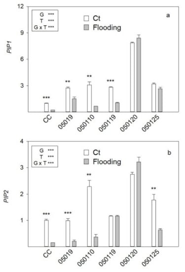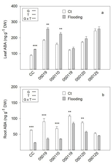 - Arbona, V.; Zandalinas, S.I.; Manzi, M.; González-Guzmán, M.; Rodriguez, P.L.; Gómez-Cadenas, A. Depletion of abscisic acid levels in roots of flooded Carrizo citrange (Poncirus trifoliata L. Raf. × Citrus sinensis L. Osb.) plants is a stress-specific response associated to the differential expression of PYR/PYL/RCAR receptors. Plant Mol. Biol. 2017, 93, 623–640. [Google Scholar] [CrossRef] [Green Version]
