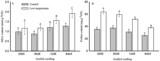 Effects of low temperature on MDA (A) and proline (B) content in leaves of different grafted seedlings. Data are the mean ± SE. Bars with different letters indicate a significant difference (p < 0.05).