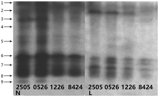To evaluate the enzyme activity as stimulated by cold stress, polyacrylamide gel electrophoresis analysis of enzyme isoform patterns was performed. No significant differences were found in POD and GPX isoforms (data not shown), but there was a significant difference in SOD and CAT isoforms (Figure 4 and Figure 5). At least five isoforms were detected in the leaves of different watermelon seedlings under both control and cold stress conditions, while CAT 6 was only found under cold stress conditions. The cold-induced increase in CAT enzyme activity coincided with the increased expression of CAT isoforms. Under both control and stress conditions, the expression of CAT isoforms in grafted watermelons was much higher than that in non-grafted 8424 (Figure 4). Conversely, the expression of SOD isoforms was downregulated by cold stress (Figure 5). Under control conditions, at least nine isoforms were detected in different seedlings, with SOD1–3 and 6–8 being the major ones, while under cold stress conditions, the expression of these isoforms was greatly diminished. Similar to CAT isoforms, the expression of SOD isoforms in grafted watermelons was also much stronger than in non-grafted 8424, among which 0526 displayed the highest expression, followed by 2505 and 1226. The differences observed in the SOD isoform patterns match the changes in total SOD activity described above.