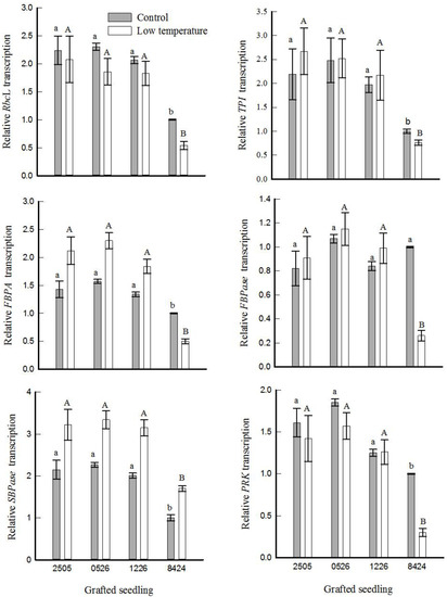 Abiotic stress is known to influence gene expression. As the last rate-limiting step in carbon fixation, the carboxylated activity of Rubisco is closely related to the Rubisco large subunit (RBCL) and RuBP [42]. In this study, the transcript levels of the Rubisco large subunit (RbcL) and enzymes involved in RuBP regeneration were analyzed (Figure 6). As shown in Figure 6, the higher transcript level of RbcL in grafted plants, especially under stress conditions, implies the existence of a correlation between cold tolerance and RbcL expression, while the latter ameliorates the photosynthetic capacity. As the main genes encoding enzymes required for RuBP regeneration, triose-3-phosphate isomerase (TPI) and fructose-1,6-bisphosphate aldolase (FBPA) catalyze two triose-3-phosphates to fructose-1,6-bisphosphate (FBP). Fructose-1,6-bisphosphatase (FBPase) catalyzes the hydrolysis of FBP to fructose-6-bisphosphatase (Fru6P), while sedoheptulose-1,7-bisphosphatase (SBPase) catalyzes the conversion of sedoheptulose-1,7-bisphosphate (SBP) to sedoheptulose 7-phosphate (Sed7P). Ribulose phosphate epimerase (RuPE) and ribulose-5-phosphate kinase (PRK) are the last rate-limiting enzymes in RuBP synthesis. Except for RuPE, which was almost unchanged between different gourd-grafted and non-grafted plants (data not shown), and FBPase, in which there was no significant difference between plants under control conditions, the other genes of gourd-grafted plants were expressed much more highly than those of non-grafted plants, especially under cold stress. These results imply that gourd-grafted watermelons could sense cold-induced changes early, and reponse with quick regulations at the transcript level so as to guarantee greater RuBP regeneration, which would activate the carboxylated activity of Rubisco and result in higher carboxylation efficiency.
