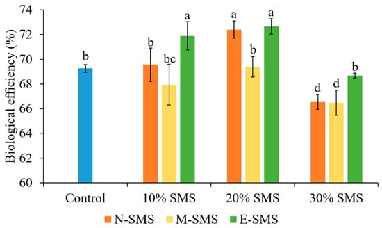 In the studies of Ashrafi et al. [39], Pardo-Giménez et al. [81], Wang et al. [82], and Picornell Buendía et al. [84], the yield and BE on substrates with SMS supplementation were directly proportional to each other. Similar results were obtained in the present study. Based on the experimental results concerning yield and BE values, it can be inferred that the yield and BE followed a similar trend, where higher yield resulted in a higher BE value. SMS supplementation, especially 10% and 20% E-SMS and 20% N-SMS, resulted in superior yield and BE values.