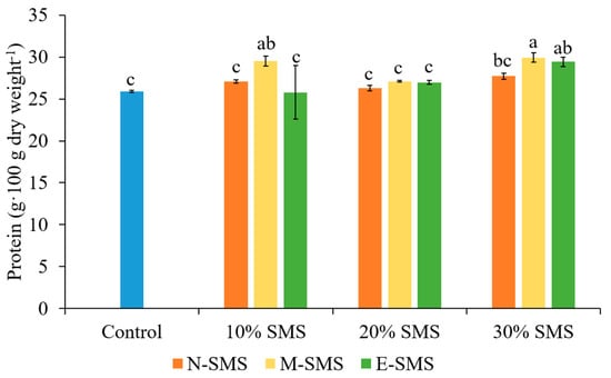 In the present study, the protein content of P. ostreatus fruiting bodies significantly varied among the studied substrates (Figure 3). The highest amount of protein in fruiting bodies of P. ostreatus was recorded in the substrate supplemented with 30% M-SMS (29.93 g∙dry weight−1). This highest amount of protein was followed by 10% M-SMS (29.53 g∙100 g dry weight−1) and 30% E-SMS (29.43 g∙dry weight−1), which were observed to be similar. However, the lowest amount of protein content was observed in other substrates except for 30% N-SMS. The results of protein content suggest that the P. ostreatus cultivated on substrates supplemented with 30% N-SMS, M-SMS, and E-SMS as well as 10% M-SMS achieved a higher protein content than that of P. ostreatus fruiting bodies grown on 100% traditional wheat straw-based substrate (control).